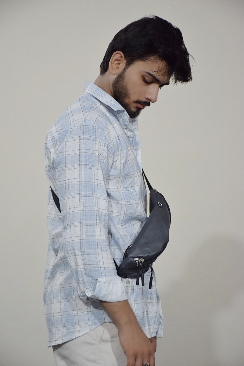 Features a soft plaid design in calming light blue and white – fresh, youthful, and easy to pair with anything.