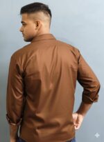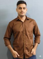 Shirt Type: The shirt is a long-sleeve, solid-colored button-down. Its fabric has a subtle sheen, which could indicate a sateen, silk, or a high-quality cotton blend.